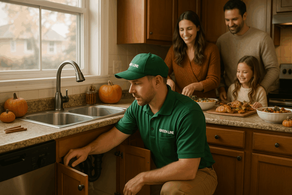 Green Line’s plumbers often recommend a quick pre-holiday drain cleaning for kitchens that see heavy use. It’s a small investment that can prevent a major mess once your guests arrive.